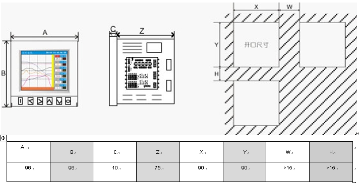 u 測量精度:±(0.2%FS+1)個字 u 電源電壓: AC85-240V、DC110V、DC24V u 顯 示:3.2寸TFT彩色320×240點陣 u 輸入規(guī)格: 熱電偶:K、S、N、E、J、T、 B、R、Wer526/523 熱電阻:PT100、CU50、CU100 線性電壓:0-5V、1-5V、0-10V、 0-20mV...... 線性電流:4-20mA、0-10mA...... 脈沖輸入:訂貨時須知脈沖大小 其它輸入:R、WRe526、mV、其它 ◆ 輸出規(guī)格: 變送輸出:4-20mA、0-10V...... (最多2路) 繼 電 器:R2A、R2B、R2C(最多2路) 饋 電:U1/U2/U3(最多2路) 打印/通訊接口:S1、S2、P USB接口:U u 記錄時間: 記錄間隔可任意設1、2、3、4、5、6、7、8……秒。 八筆記錄:360天 (記錄間隔1分鐘) u 斷電保護時間:用FLASH MEMORY保存設置參數(shù)和歷史數(shù)據(jù),斷電后永久保存,采用硬件時鐘,掉電后也能準確運行。 u 環(huán)境溫度:-20-50℃ u 環(huán)境濕度:0-85%RH ◆ 外形尺寸:96×96×85mm u 安裝尺寸:92×92×75mm |