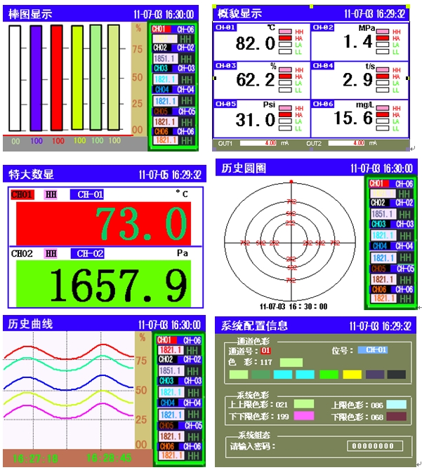KH300AG智能小型彩色無紙記錄儀(96×96mm最多6通道輸入)具有全隔離萬能輸入功能,集熱電偶信號、熱電阻信號、標準電壓、標準電流、脈沖信號于一體。可提供通訊、打印、報警、饋電等功能。儀表具有強大的顯示功能,高精度棒圖顯示、實時曲線顯示、歷史曲線追憶、中圓圖顯示、歷史圓圖追憶、報警狀態(tài)顯示,同時可直接查詢年、月、日、時、分、秒的數(shù)據(jù),快捷方便,頁面刷新速度小于1秒。使用RS232/485通訊,標準MODBUS-RTU協(xié)議,可與組態(tài)王、MCGS等專業(yè)軟件進行組態(tài)。數(shù)據(jù)可直接通過任意U盤導出,U盤即插即讀,無需任何操作;分析軟件可導出EXCEL數(shù)據(jù)格式或曲線格式,直接打印即可,兩者同時使用或兩者選其一。